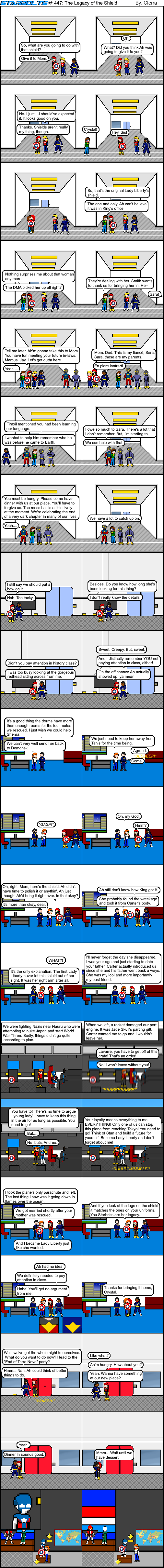 This week's comic has a little bit of history in it doesn't it? Check out Andrea's uniform from when she worked with the first Lady Liberty. Does the design look familiar? It should. Crystal has a design similar to that now. Interesting. It's also interesting to note that Marcus's mother designed BOTH uniforms. She's like the Edna Mode of this universe. Still, we have no capes!