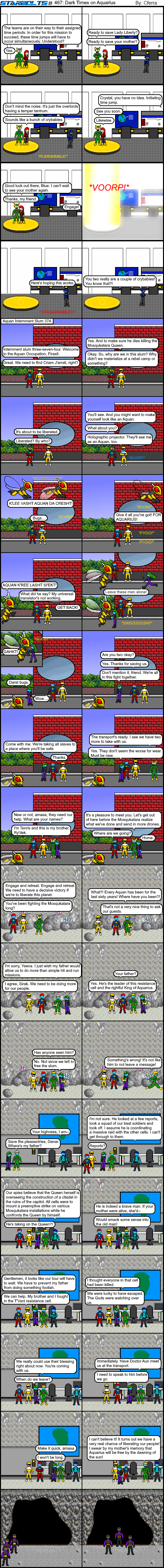 The time traveling Starbolts are off on their adventure and their first stop is the Aquan Occupation. This was a dark time in Aquan history. For sixty years, aliens known as the Mosqukatara enslaved the people of their world. They were forced into labor camps, slums and exterminated for following their religion. There were other atrocities the bugs committed. The water was heavily polluted and that forced many to take shelter on land.