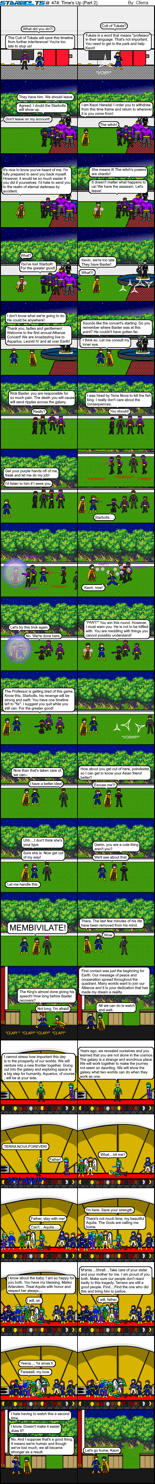 As of this comic, we just have one more time zone left to fix. After that, we'll be catching up with Manta and Crystal and then we'll have our epic showdown with the Professor and his so-called "Cult of Tukala". There we will see his true strength. It's going to take every Starbolt working together to defeat his army. We've only been dealing with the grunts. His really strong forces are with him and they are biding their time.