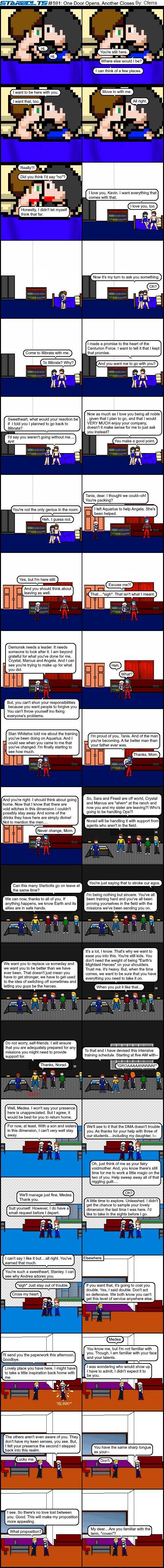 Looks like people are splitting off again. Kevin and Angela will be going to Illibrata and we will definitely be following their adventures there as we race to Starbolts #600. What awaits them on Illibrata and will the heart be grateful Angela no longer possesses its phenomenal cosmic powers? I hope so! It looks like those two have taken the next step in their relationship. Things are going well for them. It's nice to see our couples move on in their relationships. A couple more milestones for the couples may be on the horizon. Stay tuned!