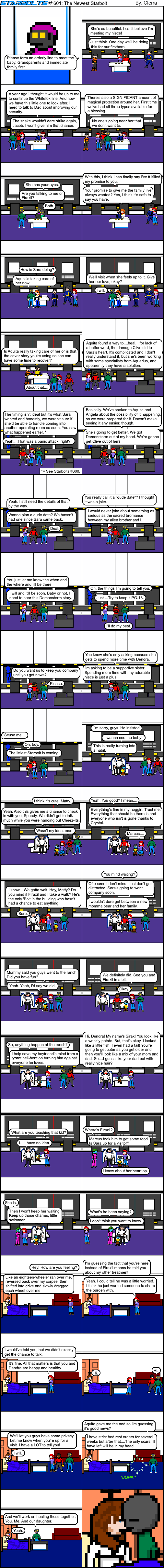 I decided to take a different approach with this year's Halloween comic. Instead of using the usual ghosts from Soldier Six, I thought I would use a different horror in the form of a demon. Sure the lesser demon was dealt with rather quickly. But, if you think about it, the doubts Firaxil and Marcus have could also be their own inner demons. Thankfully, both were dealt with by their mentor/father-in-law, Stan. He's been the Starbolts' mentor since they were teens and it looks like they will always need his guidance.